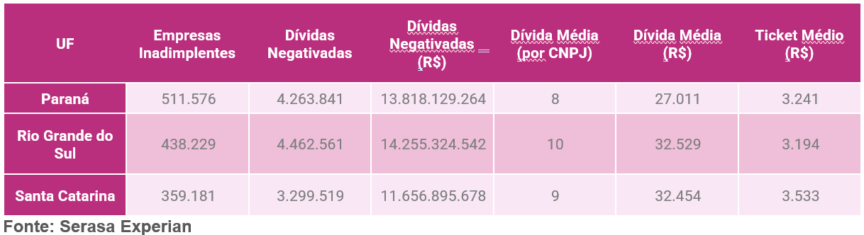 O Sul do país contabilizou pouco mais de 1 milhão de empresas inadimplentes em agosto. O Paraná liderou com 511.576 negócios em atraso, seguido pelo Rio Grande do Sul (438.229) e Santa Catarina (359.181). Apesar de apresentar o menor número absoluto, Santa Catarina teve uma das maiores médias de dívida por companhia, superando R$ 32 mil por CNPJ. Confira a tabela a seguir com o detalhamento por Unidade Federativa (UF) da região:
